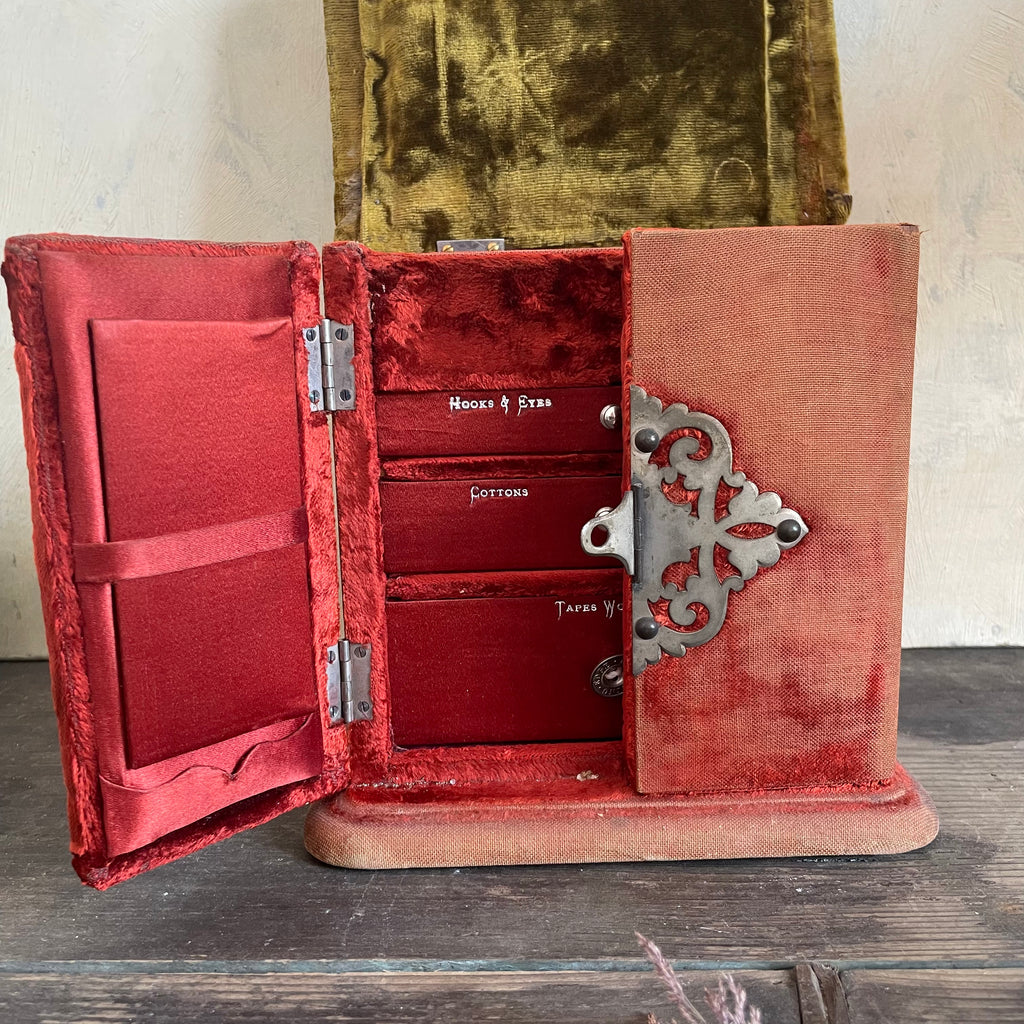 A beautiful Victorian Velvet Sewing Box, I love anything antique and velvet and this beauty caught my eye! A beautiful colour and ware, there has been some adjusting and renewing but this just shows the progression of time.